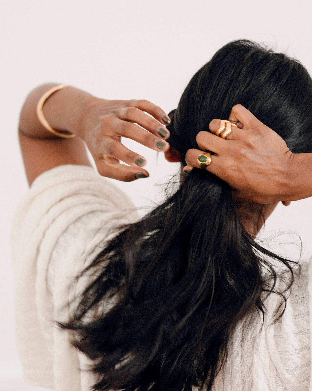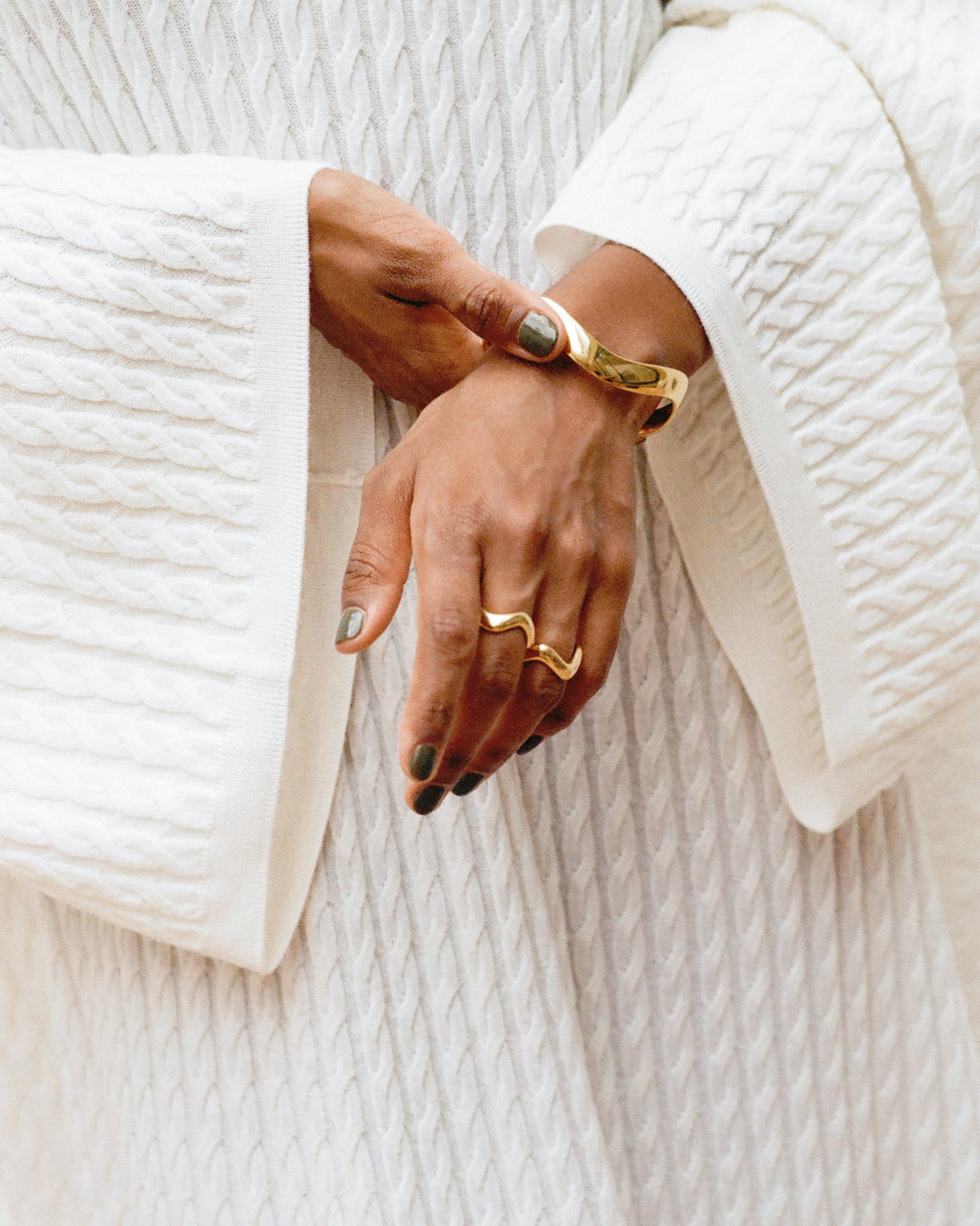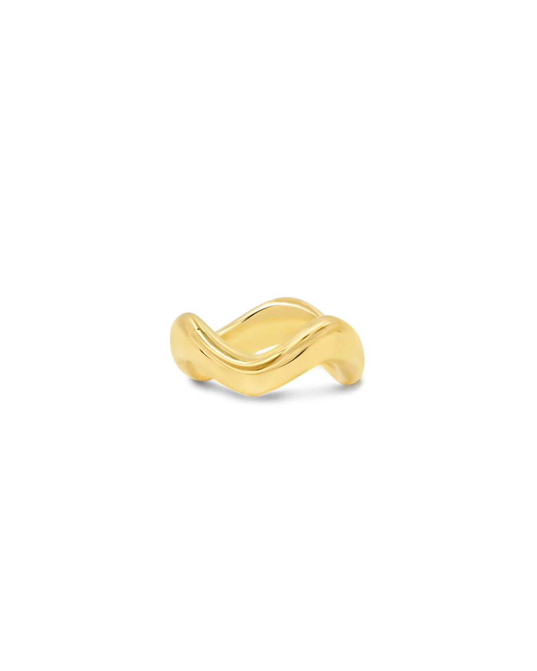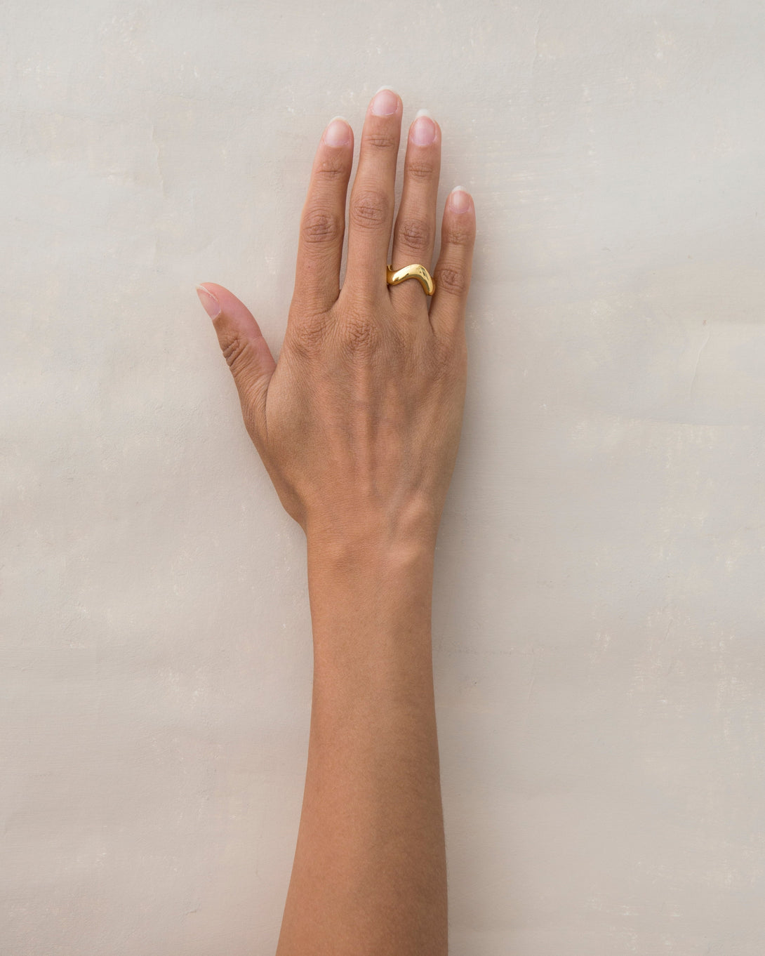 We love to see Monikh's 18ct gold-plated Deol stacked together but she is just as beautiful worn on her own. A thick, waved ring that feels contemporary and bold. Pair with another ring and stack to recreate Monikh's look.