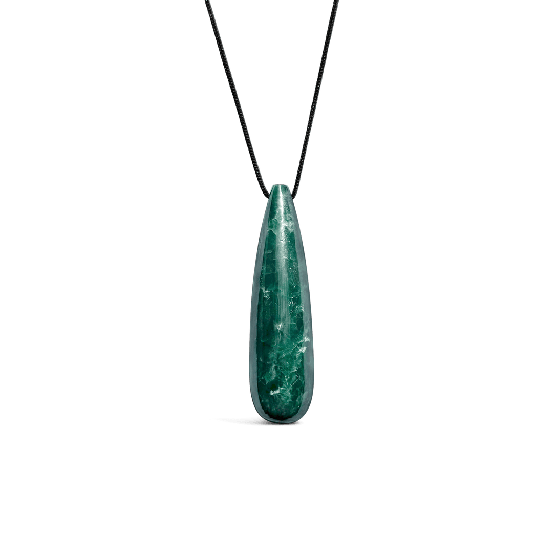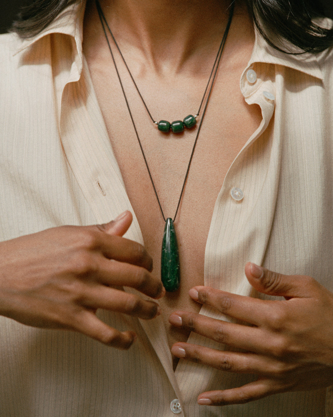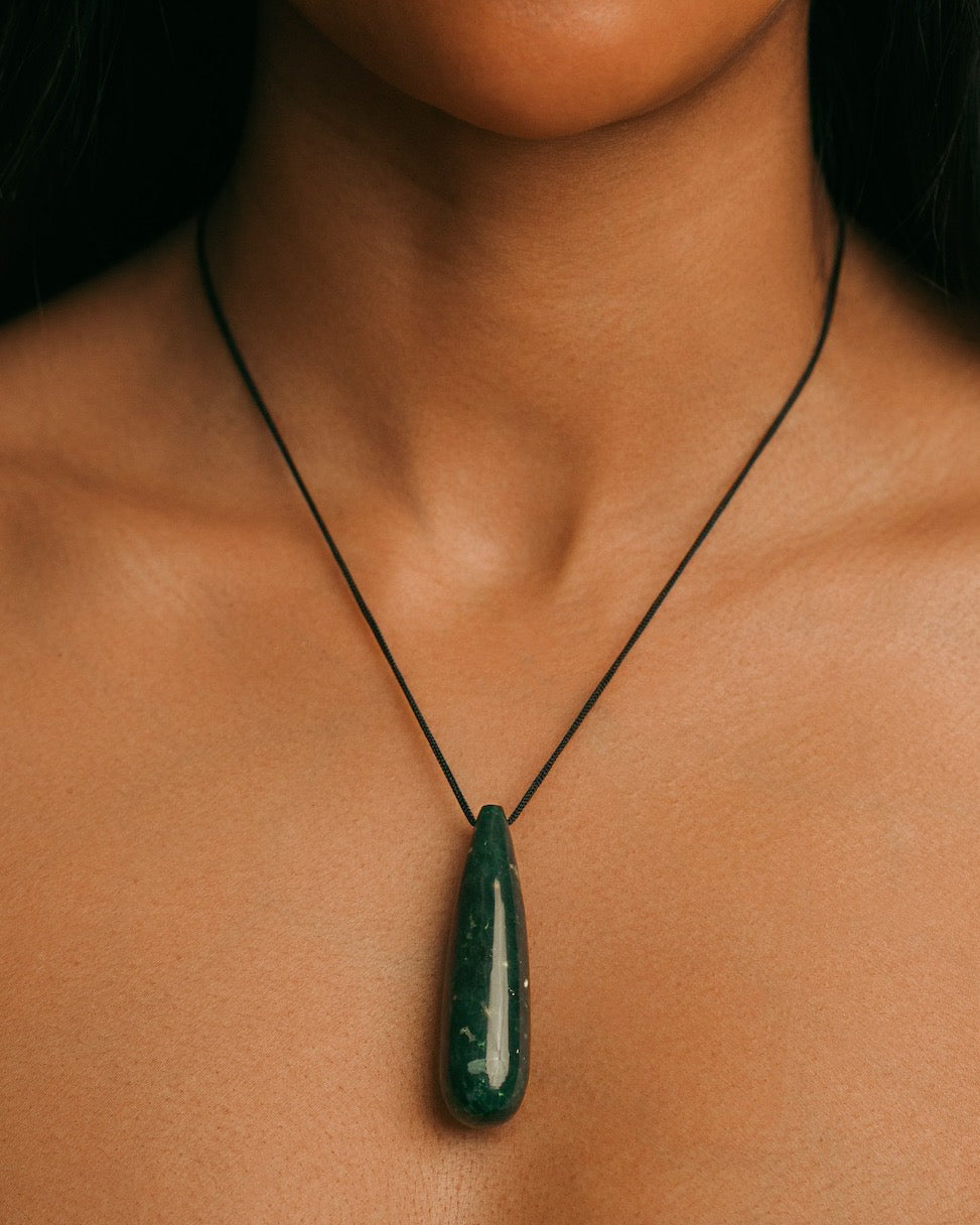 A striking Jade stone teardrop-shaped pendant is at the heart of the Dhari Necklace. Meticulously polished to reveal its unique natural lines and rich green hues, each pendant is one-of-a-kind, ensuring that no two stones are alike. The stone hangs from a long rope which can be adjusted to your desired length. We love it stacked with the Dale Necklace for the perfect summer look.