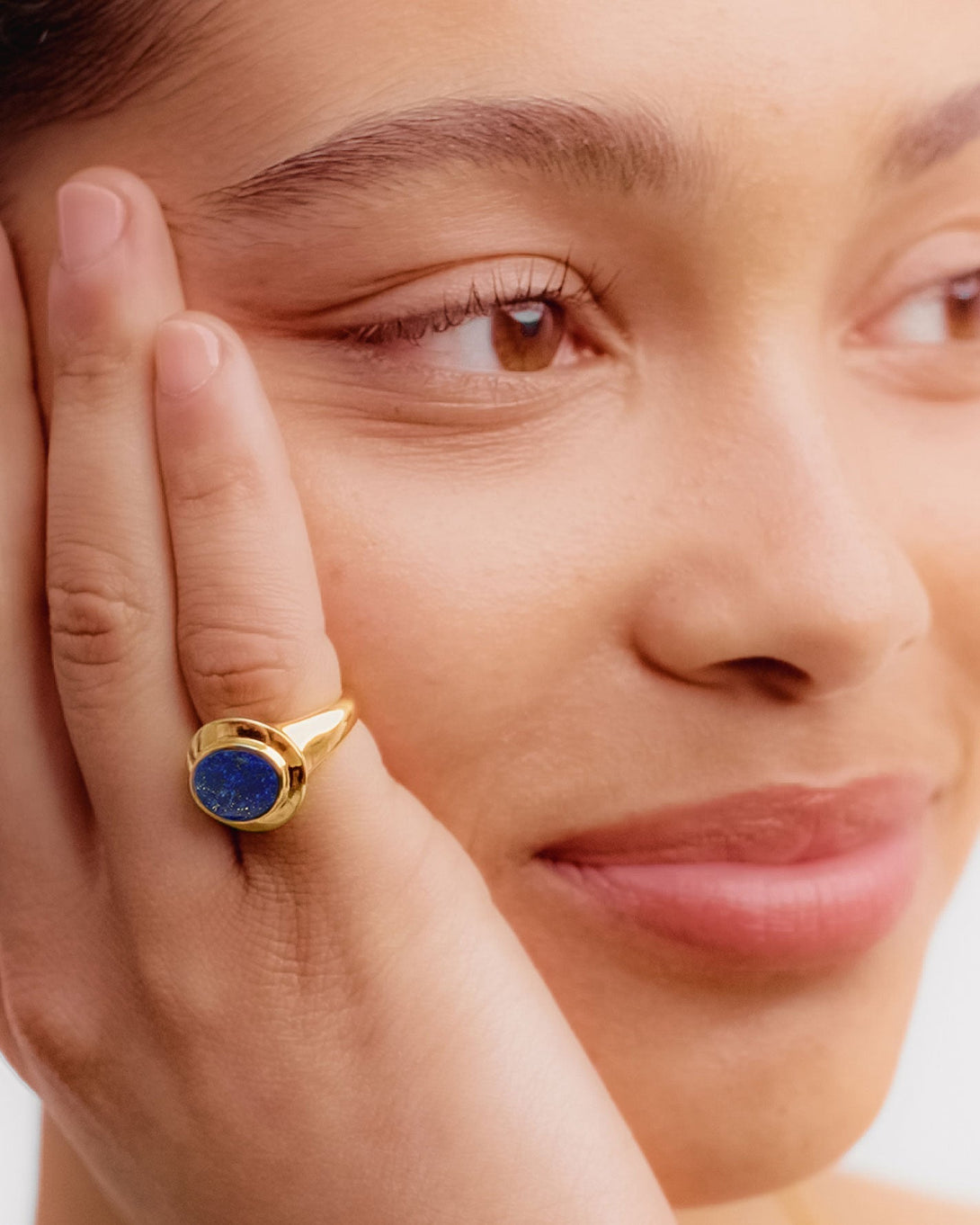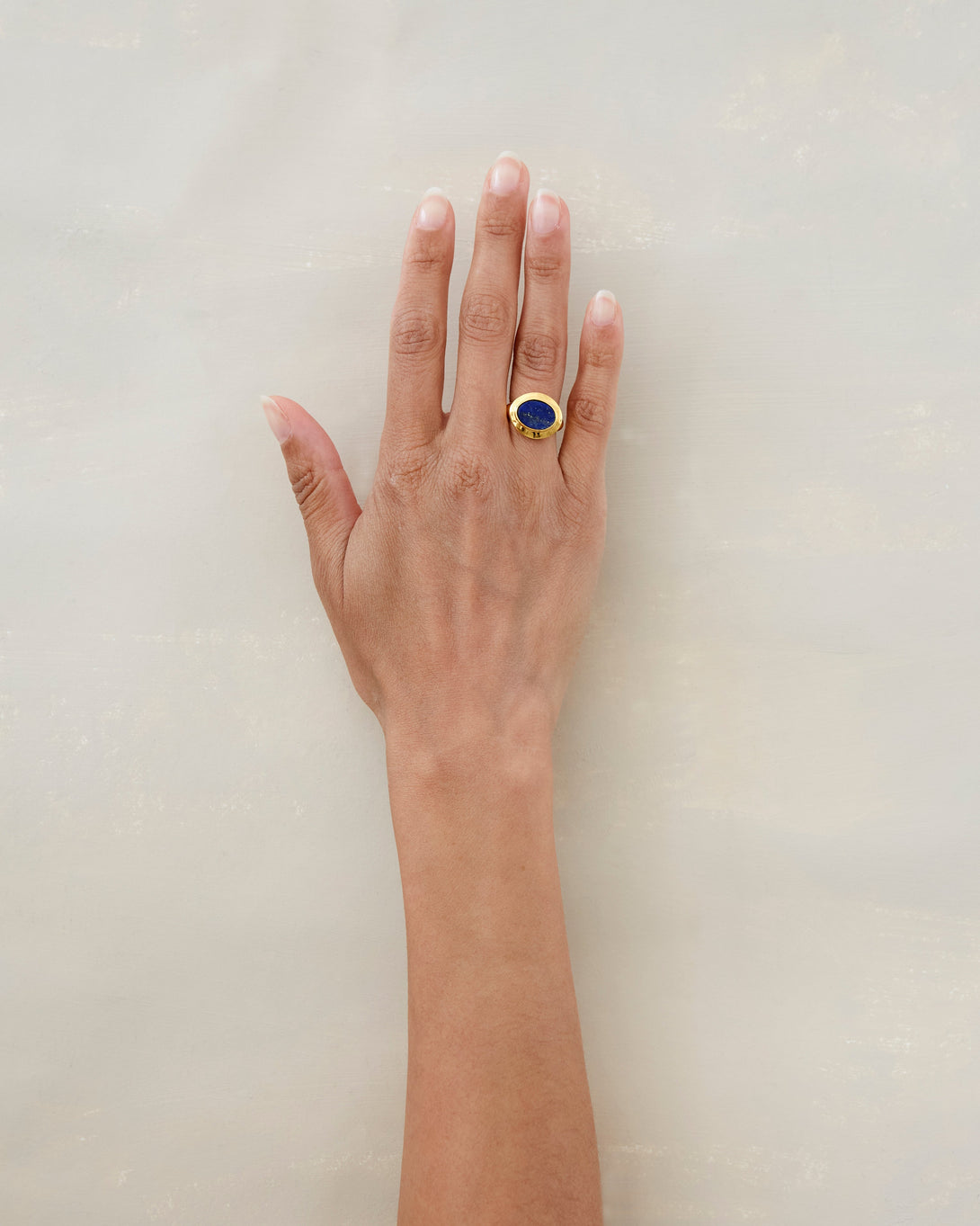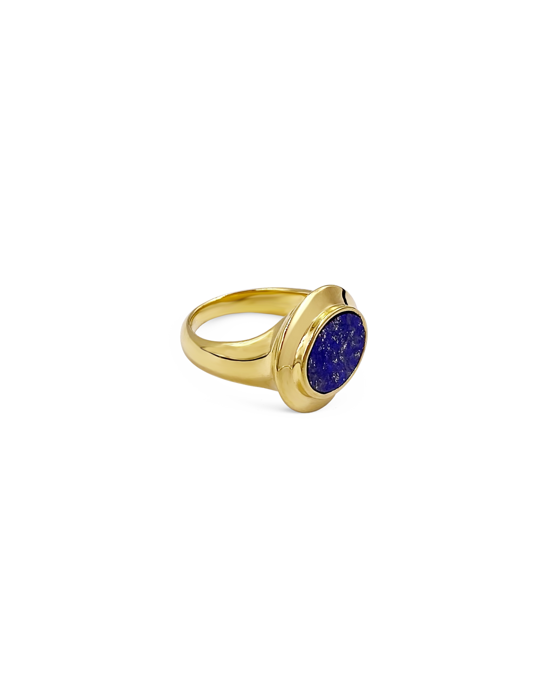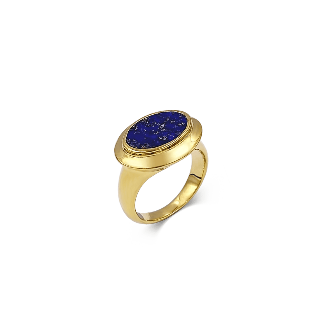 Deep blue Lapis Lazuli, a semi precious stone that evokes the ocean, is at the heart of the Rita ring. A flat stone set in a chunky gold setting.