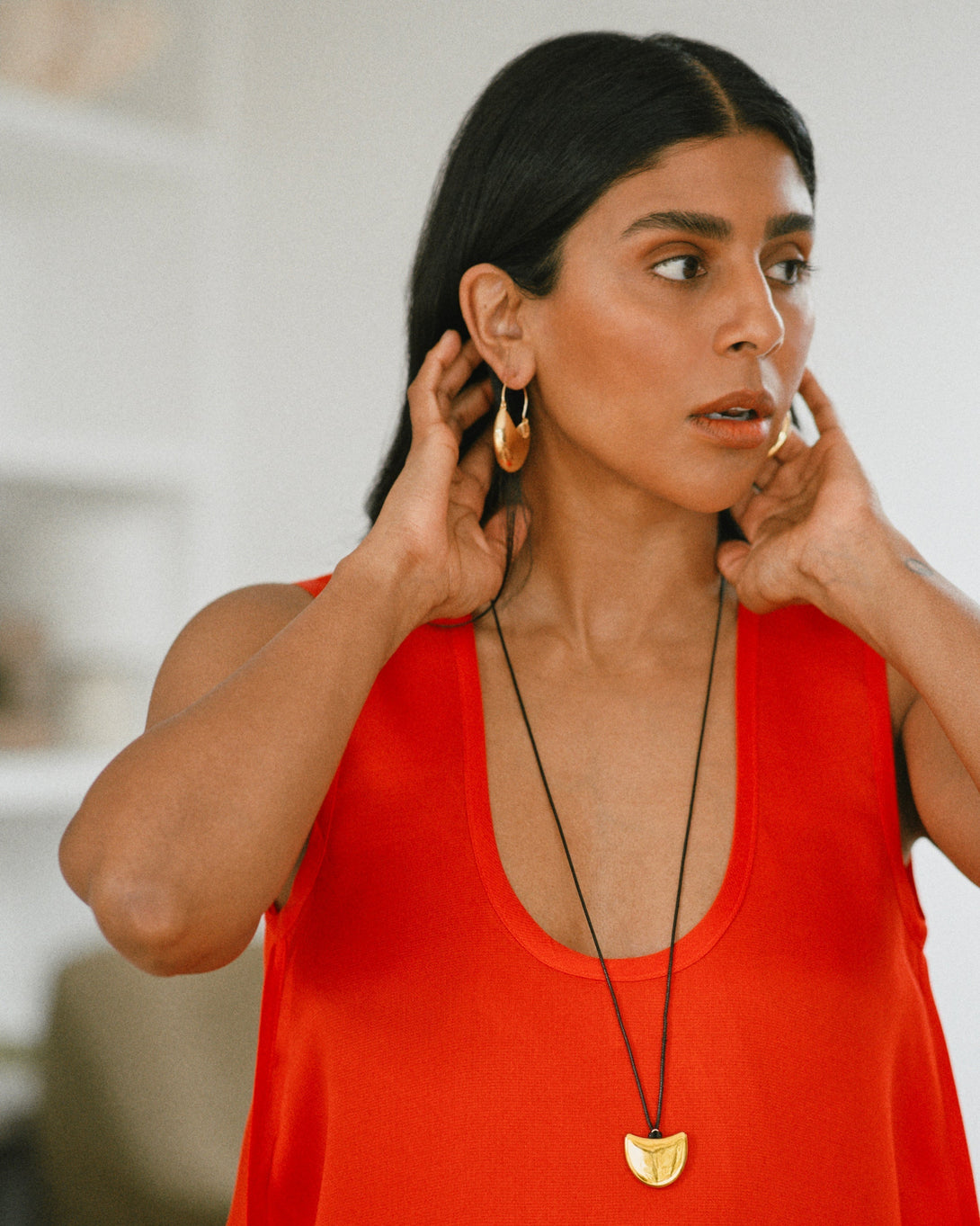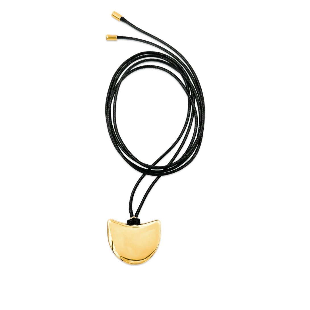 At the heart of our collaboration with Monikh, the Singh necklace features a sculptural 18ct gold-plated pendant, finely polished to a mirror-like finish, with a luxurious weight to it. The pendant hangs gracefully from a fine rope cord that can be adjusted to your preferred length, reminiscent of summer days and carefree elegance.